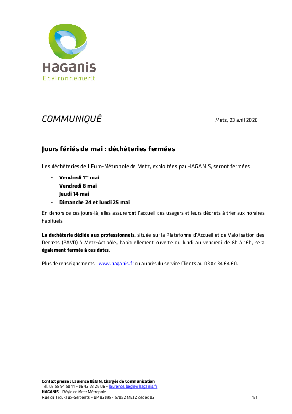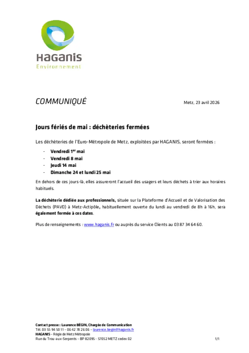 Déchèteries fermées jours fériés de Mai