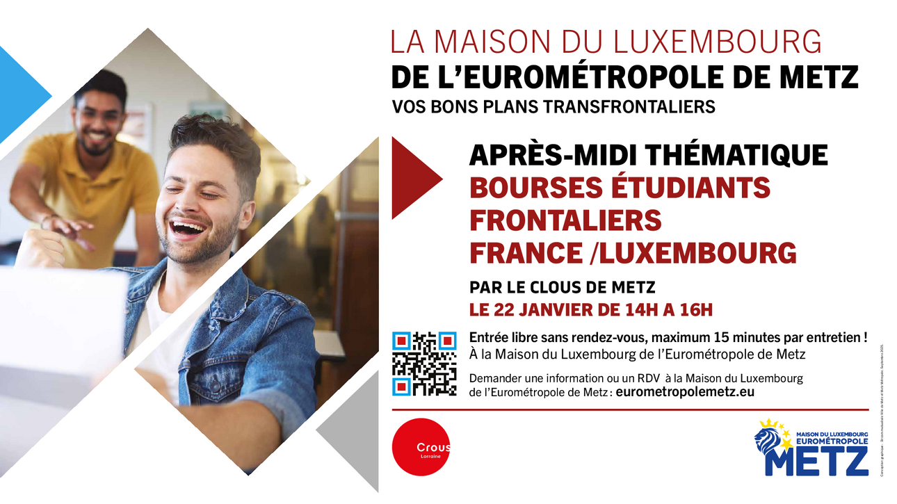 La Maison du Luxembourg de l’Eurométropole de Metz organise en partenariat avec le CLOUS de Metz un après-midi thématique « Bourses Etudiants Frontaliers France/Luxembourg » le jeudi 22/01/2026 de 14h00 à 16h00.